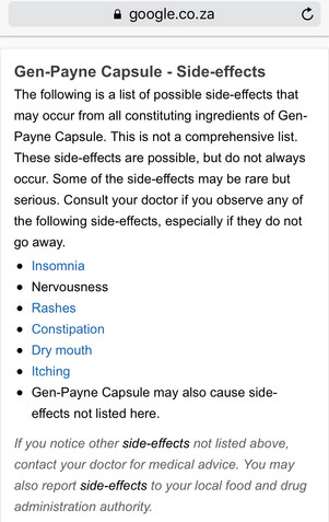 Gen-payne another evil medication sent home, this again with so many side effects. Mad as hell I took all those tablets and threw them in the dustbin. That was that and enough was enough!